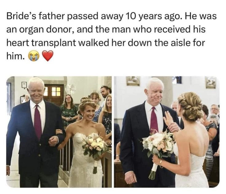 When the grand church doors opened, the man who now carried her father’s donated heart stepped forward, offering his arm with a gentle, emotional smile ❤️. She took a slow, trembling breath as she placed her hand on his arm, and in that instant, she felt it—the familiar, comforting rhythm of her father’s heartbeat echoing through another person’s chest. It was a feeling so powerful that her knees weakened. Tears filled her eyes as they began their walk down the aisle, each step becoming a bridge between past and present, loss and gratitude, sorrow and healing.