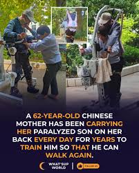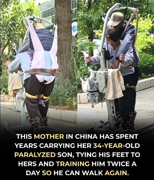 Some days, she climbs into the walking aid herself, lifting her grown son onto her back, tying their legs together, and guiding him step by step as if teaching him to walk all over again. 👣💞