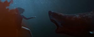 The trailer’s tone shifts brutally when their research vessel is slammed by an unseen force. Metal shrieks, alarms blare, and within seconds the ocean swallows their boat whole. Nancy and Dr. Turner escape into the water, blood blooming around them as the monstrous shark circles with terrifying speed. They barely reach a drifting research pod—damaged, waterlogged, and sinking by the minute. The claustrophobic tension skyrockets as they seal themselves inside, their breaths cold and shallow. Every shot emphasizes their isolation: miles from land, night descending, and a predator waiting just below the waves.